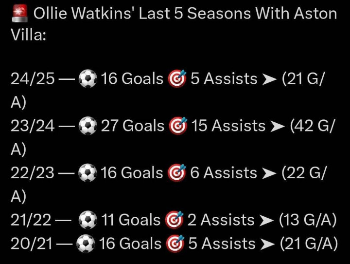 沃特金斯在效力维拉的184场英超比赛中打进75球,过去的5个赛季英超进球都达到了两位数,包括上赛季参与21个进球,在中锋里仅次于伊萨克(29球)和哈兰德(25球),故此他被曼联转会部门的一些人视为最有可能在联赛确保进球的中锋目标。